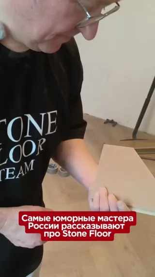 Мы монтируем стоунфлор. Стоунфлор — это керамический ламинат с металлическими опилками (медная прессованная руда). Короче, это необычная деревяшка. Он 100% влагостойкий. Действительно влагостойкий. У нас где-то есть образец, он просто живет в воде и ничего с ним не происходит. Воды не боится аб...